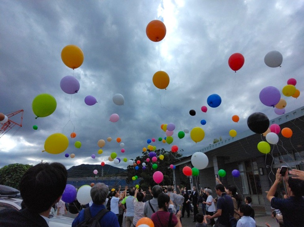 読経法要の後、雲間から光が差し込む大空へ 「想いを込めた風船」 をリリースしていただきました。